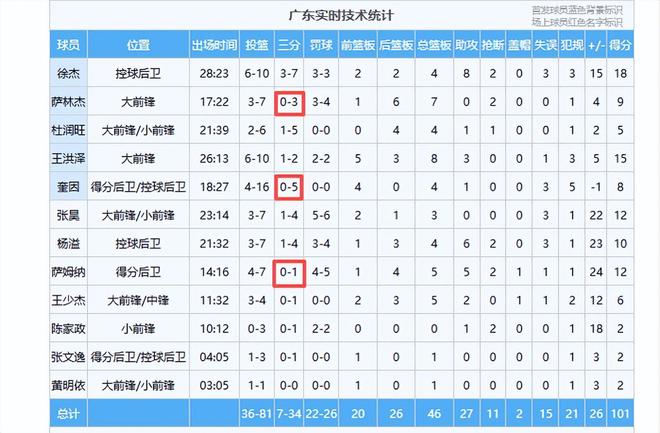 没错,说的就是三分球。本场比赛,广东队三分34投7中,命中率为21%,面对弱旅打出这样的命中率真是太低了。特别是三名外援的三分命中率均为0,奎因没了上一场的手感,5中0,萨林杰3中0,萨姆纳1中0,三名外援的三分命中率均为0,也是奇怪和尴尬了。
