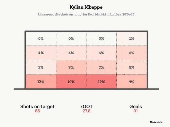 他的表现非常出色;打入16球并助攻2次,平均每63.38分钟比赛时间就参与一个进球。他在2025-26赛季至今的每次射门预期进球值为0.183,高于上赛季的0.164,也高于他在前俱乐部巴黎圣日耳曼最后三个赛季的数据(2021-22至2023-24赛季分别为0.162、0.180和0.180),这也表明他能在更好的位置完成射门。